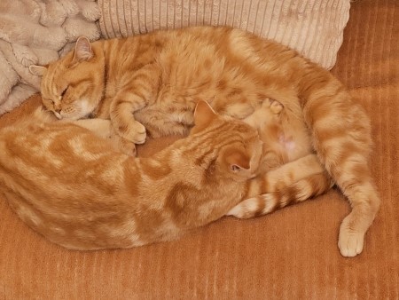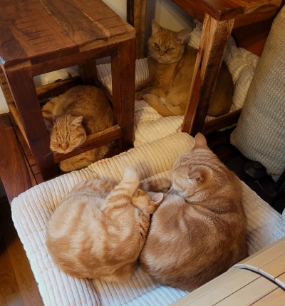 1. ledna 2025 Nový rok jsme začali slibně. Panička si konečně uvědomila, že práce není všechno a vyvaluje se s kočičákama na kanapíčku. Jaké ale překvapení, Maxík („ZRÁDCE!“) vyhledává přednostně páníčka a ten celý rozněžnělý úplně zapomněl, že je alergik. Jeho černá mikina na sebe statečně nalepuje zrzavé chlupy dospívajícího kotěte. Každopádně čas utíká a za 2,5 měsíce bude Maxík "plnoletý"...