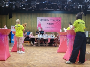 Ukecali mě! Jel jsem do Příbrami a předváděl se před úplně cizíma lidma! A přitom všichni kolem věděli, jak cizí člověky nesnáším! Když jsem ale po silných protestech v autě přijel na výstavu, uvědomil jsem si, že mám svůj oblíbený pelíšek a tak jsem se pod něj nejdřív schoval. Po chvilce jsem zjistil, že to nejsem já, kdo se předvádí, ale že se lidi producírujou před mou klecí a tak jsem se způsobně uvelebil a po očku si je začal prohlížet. Brzy mě to přestalo bavit a skoro celý den jsem prospal. Jen občas jsem si nechal do tlamičky dávat granulky, ani k vodičce jsem se nemusel zvedat :-) Takže když mě vytáhli, abych se šel ukázat nějakýmu Švýcarovi (Rolf Voehringer), tak to bylo docela fajn zpestření. Pozdě jsem si uvědomil, že ten barák je ňákej přeplněnej. Vibroval jsem paničce v náruči a všichni se tomu smáli. No tak jsem si řekl, že jim ještě ukážu! Od toho mužskýho jsem se nechal prohlídnout a on mi za to napsal V1. Potom jsem ještě šel uklidňovat ségry, když nás posuzovala pani z Finska (Satu Hamalainen) jako celý VRH. Musel jsem na holky pořádně zasyčet a zavrčet, aby taky nedělaly ostudu. Asi to zabralo, protože jsme nakonec vyhráli v nominacích BIS docela pěknej pohár. Mamča v Třebíči z nás má určitě velkou radost!