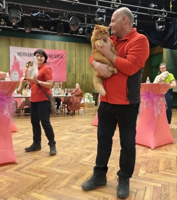 Ráno jsme si mohli přispat, protože Plzeň je od nás ani ne hodinku cesty, ale já jsem pro jistotu budil páníčky svým toužebným vyvoláváním průběžně po dvou hodinách, takže v šest ráno jsme se začali chystat na cestu. Vyrazili jsme v půl osmé. Trochu mě zaskočilo, že byl sál v Plzni tak malý a panička se divila, že dokáže někdo postavit kočku na tak neupravenou podlahu. Pořádně jsme si vydezinfikovali klec, kterou jsme si našli vzadu sálu, kde bylo víc volného místa kolem nás. Na posouzení jsem šel k pani Bertě Němcové. Moc se jí líbila moje červená barva kožíšku, ale zdál jsem se jí zatím stále dost mladý na své dosavadní úspěchy. Však plánujeme brzy pauzu a letní odpočinek. Přijela se za mnou podívat i Gabča s Irenkou a byly svědkem toho, že jsem na vlastní kůži vyzkoušel, jak je "čistá" podlaha. Na posouzení se nedařilo jedné kočičce, která si vyřvala odchod z posouzení takovým způsobem, že já vzal z náruče nohy na ramena. Nějak moc jsem ale pozornost okolí nepřilákal. Třeba páníček si toho vůbec nevšiml! Panička mě hledala pod klecema uprostřed a já byl místo toho pod svou klecí na konci sálu. Přece vím, kde mám výbavičku, ne!?! Domů jsme se dostali poměrně rychle a brzy. Mám další titul CAGCIB.