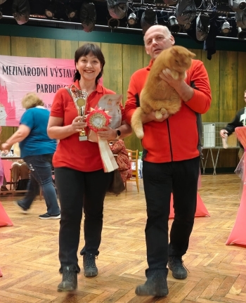 Neděle... Slavil jsem od 4 hodin ráno, s paničkou jsme si udělali "mejdlo". Baštil jsem, bumbal jsem, lovil jsem a mazlil se. A že celý víkend jsem byl neskutečně roztomilý!!! Oslavovali jsme včerejší úspěch a dnešní poslední výstavu ve třídě koťat. Dneska se mi taky stalo pár povedených kousků. Třeba když si páníček dával pastu na zubní kartáček, všeho jsem nechal a skoro panáčkoval u jeho nohou. Panička mi musela vysvětlit, že to není moje dobroučká pasta na bezoáry Nebo když odcházeli páníčkové na snídani, z legrace mi nakázali, abych si nehrál na puštěném počítači. Jak byli překvapeni, když se po snídani vrátili a já seděl na posteli a koukal se na pohádky v televizi, kterou jsem si pustil nejspíš šlápnutím na televizní ovladač A když jsme zabalili, všechny věci dali do auta i se mnou v přepravce, panička málem omdlela, když z kufru vyběhlo něco zrzavého. A ono se tam za tu chvilku navezlo droboučké zrzavo bílé koťátko Na výstavě bylo hned vidět, že jsem v dobré psychické kondici. Přerovnával jsem si pelíšek, koukal na lidi a syčel na otravnou kočičí sousedku. Bylo znát, že už mám něco za sebou. Nedělní výstava byla docela méně obléhána jak kočičáky, tak i návštěvníky, ale moje konkurence nechyběla, jen se vyměnil jeden červený mramoráček s červenou mramoračkou. Na posouzení u pani Ainy Hauge z Norska jsem se choval velice způsobně a líbil jsem se tak, že mě zařadila do rozstřelu na BIV. Samozřejmě, že jsem před tím získal EX 1 s diplomem a kokardou. Překvapivě jsem vyhrál opět BIV ze čtyř koček a dostal medaili za nejlepší v barvě. Takže jsem se zúčastnil i rozstřelu na BIS. A opět s německým bikolorkem, jehož majitel byl značně překvapen, když jsem nominaci do BIS dostal já s další medailí. Neskutečný úspěch být nominován na nejhezčí kočku výstavy! Soutěžil jsem v počtu tří kocourků a ze čtyř jsem dostal i já jeden hlas od posuzovatelů. Prostě paráda! Dokonce jsem se setkal poprvé se svým kočičím tatínkem, který se ale moc dlouho nezdržel, musel s paničkou Alenkou domů. Naše cesta domů bez zastavení trvala 3,5 hodiny (405 km), přestože před Prahou byla tma, mlha a pršelo. V autě jsem nevyváděl, naši mě pustili z přepravky jakoby na záchůdek (na výstavě nikdy nechodím a v autě jsem taky nešel) a pak vyměkli a nechali mě puštěného, protože jsem se díval z okýnka nebo spal na klíně paničky. To je vlastně jediná věc, kterou moc nedělám a mamina si to náležitě užívala. Sem tam jsem se šel podívat z okýnka, ale dvě třetiny cesty domů jsem prospal. Doma už mě vítal Kája a Mourek... no, Mourka spíš zajímaly moje ceny, většina jich bylo k nakousnutí Dá se říct, že to byly nečekaně úspěsné dvě mezinárodní výstavy, zvlášť, když se sem sjeli jen samí briťáčci. Kdysi jsem jeden pohár už dostal, když jsem soutěžil jako 3 měsíční koťátko spolu se sestřičkama ve vrzích v Příbrami, ale nečekal jsem, že někdy dostanu svůj vlastní pohár ve speciální soutěži za nejhezčí kresbu výstavy