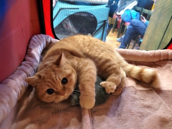 Sobota…Viničné, kde byla ve sportovní hale výstava, bylo jen co kamenem dohodil… Sám jsem si vybral klec a začal nacvičovat mazlící polohy. Na posouzení jsem šel k panu posuzovateli Martinovi Kabinovi (CZ). Poté, co mi pořádně prozkoumal ocásek a vyjádřil se kladně o jeho délce a šířce, jsem si vyslechl chválu na svou velkou svalnatou postavu s krátkýma pevnýma nohama, na hezký profil, na velké sytě oranžové oči, na skvělou kvalitu srsti (a to i přesto, že teď hodně línám) a samozřejmě chválu na výraznou kresbu. Nabyl dojmu, že jsem milý, klidný kocourek ve výborné kondici… Klidný, to já tedy jsem! Dokonce mě převalil na záda a šimral na bříšku. A jak všichni kolem mě ví, nemám takové omezování v náručí příliš v oblibě. Nechal si mě ještě do výběru na rozstřel. Na výstavě bylo hodně britských kocourků a jeden bikolorek se mnou poměřoval krásu před rozstřelem. Dál jsem nepostoupil, ale panička měla i tak radost z toho, jak jsem se vystavoval (zvlášť, když poryvy větru způsobovaly hluk připomínající projíždějící lokomotivu) a z dalšího zaslouženého titulu CAGCIB.