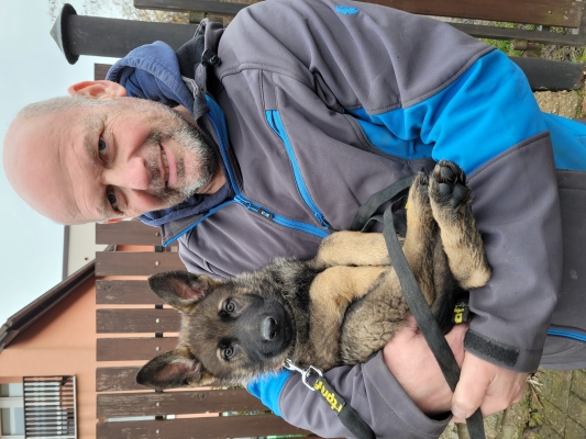 Páníček nedbal toho, že panička běhala po zahradě ve dvě v noci a s čelovkou definitivně schovávala všechny psí věci. A tak se stalo, že během dalších dvou dnů proběhla léčba šokem a už u nás bydlí 9ti týdenní štěně vysněného vlkošedého německého ovčáka. Začátek dokonalý taky vůbec nebyl. Bříško jak balónek a zažívací potíže. Tentokrát to vzal do svých rukou páníček a podržel tu všechny nad vodou. Je středa a z „pumlíče“ je nádherné štěňátko. Jmenuje se Kevin („Keví“). Panička to sice furt plete, ale nemá čas smutnit. Stará se o zažívání toho drobečka. Páníček dělá „psí kusy“, aby si u nás zvykl co nejdříve. Potlačil alergické reakce a spí spolu u koček v Aydíkárně, v teple u krbových kamen. Chlupáček už neblindí a čůrá na zahradě a s příchodem úplňku má konečně normální hovínko. Přestává smutnit po mateřském mlíčku, přecházíme z krmení masem postupně na granulky. Je to Božan! Chodí ke kocourům a tahá z pod Fandy deku z pelíšku. Kočičáci ho neuvěřitelně tolerují...